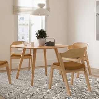 Pictured is the Conan round table 54”, and six Meja leather dining chairs. Both are Excellent quality, easy to assemble, and sturdy.